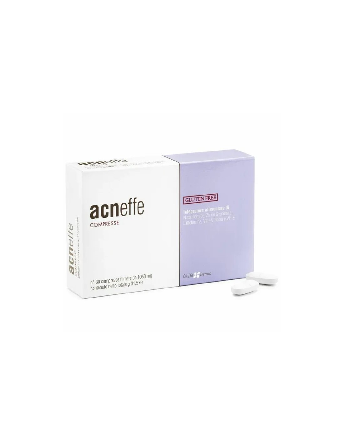 Integratore alimentare che aiuta a combattere uno ad uno tutti i fattori concausa del problema acne. Gli attivi presenti nella compresse, agendo da antinfiammatori, antiradicali e antibatterici, contrastano i quattro fattori scatenanti l'acne. Nicotinamide, vitamina E, lattoferrina e olio di lino agiscono in sinergia per un trattamento coadiuvante nella terapia dell'acne.