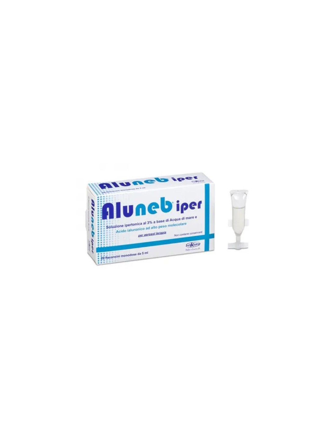 Aluneb iper è una soluzione salina ipertonica al 3% da nebulizzare mediante aerosol e doccia nasale, a base di acido ialuronico ad alto peso molecolare e xilitolo con azione decongestionante e fluidificante sulle mucose nasali.