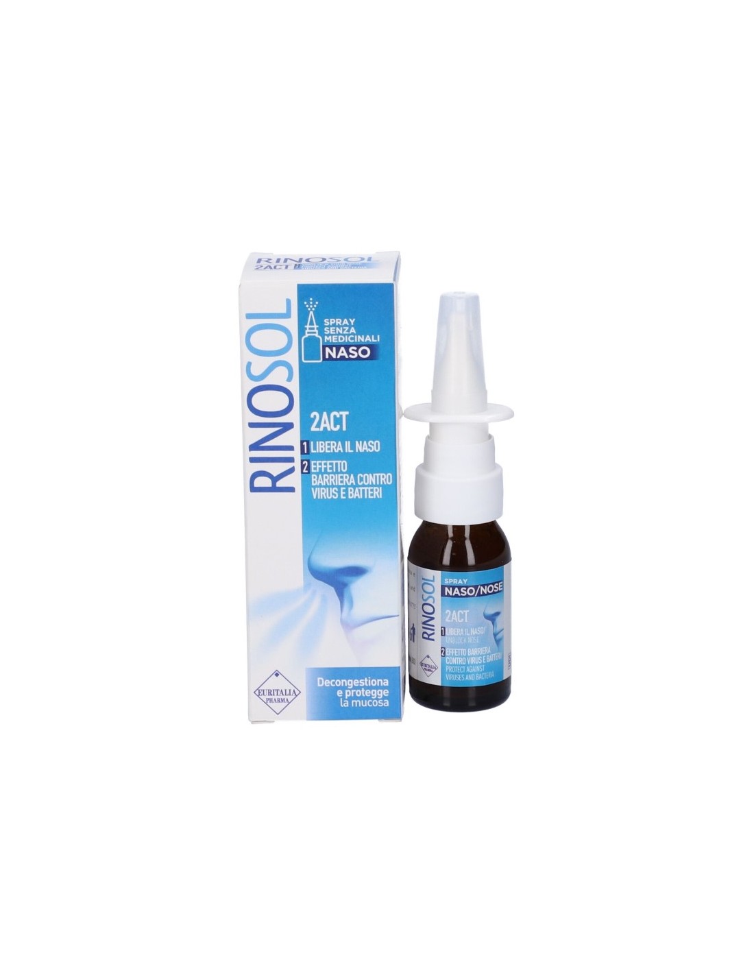 Dispositivo Medico che unisce un’efficace azione decongestionante ad un’azione protettiva della mucosa nasale. È indicato nei casi di congestione e irritazione della mucosa nasale, come nelle sindromi influenzali, raffreddore, riniti allergiche e sinusiti, sia acute che croniche. Rinosol 2ACT agisce grazie ad un complesso attivo naturale di tannini, resine, polisaccaridi e flavonoidi che interagisce con la mucosa nasale svolgendo una doppia azione: