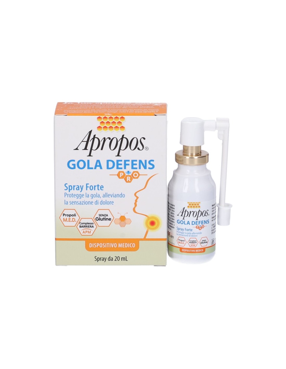 Apropos Gola Defens PRO, grazie al Complesso Barriera APM composto da “Attivi Polimerici Mucoadesivi”, crea un film mucoadesivo ad effetto barriera che protegge la mucosa orofaringea dall’attacco di agenti esterni dannosi, idratandola e svolgendo un’azione lenitiva. Grazie all’azione filmogena ed alla presenza di Propoli M.E.D., Apropos Gola Defens mantiene la gola protetta dagli agenti esterni, alleviando la sensazione di dolore legata agli stati irritativi della gola, tipici delle faringiti e delle tonsilliti.