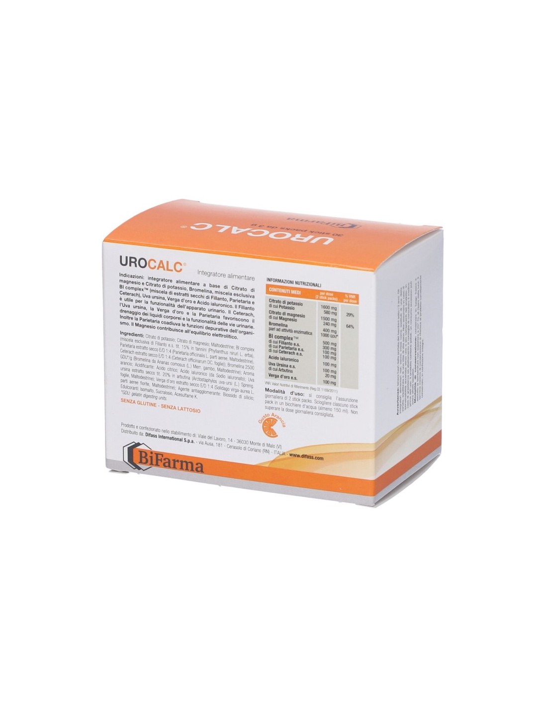 Citrato di potassio, citrato di magnesio, maltodestrine, BI complex [miscela esclusiva di fillanto e.s. tit. 15% in tannini (Phyllanthus niruri L. erba), parietaria e.s. E/D 1:4 (parietaria officinalis L. parti aeree, maltodestrine), ceterach e.s. E/D 1:4 (Ceterach officinarum DC. foglie)],bromelina 2.500 GDU*/g [bromelina da Ananas Comosus (L.) Merr. gambo, maltodestrine], aroma arancio; acidificante: acido citrico; acido ialuronico (da sodio ialuronato), uva ursina [Arctostaphylos uva-ursi (L.) Spreng. foglie, maltodestrine], verga d’oro e.s. E/D 1:4 (Solidago virga-aurea L. parti aeree fiorite, maltodestrine); agente antiagglomerante: biossido di silicio; edulcoranti: isomalto, sucralosio, acesulfame K.