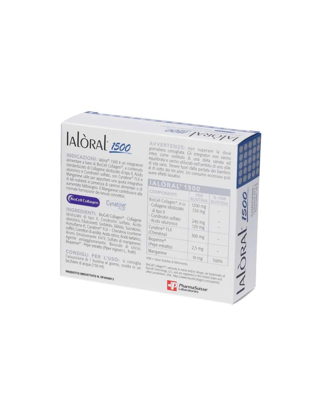 Ialòral 1500 è un complemento alimentare a base di BioCell Collagen (Collagene idrolizzato), a contenuto standardizzato di Condroitin Solfato e Acido Ialuronico, con Cynatine® FLX e Manganese utile per apportare una quota integrativa di tali nutrienti in presenza di carenze alimentari o di aumentato fabbisogno. Il Manganese contribuisce alla normale formazione dei tessuti connettivi (collagene, cartilagini).