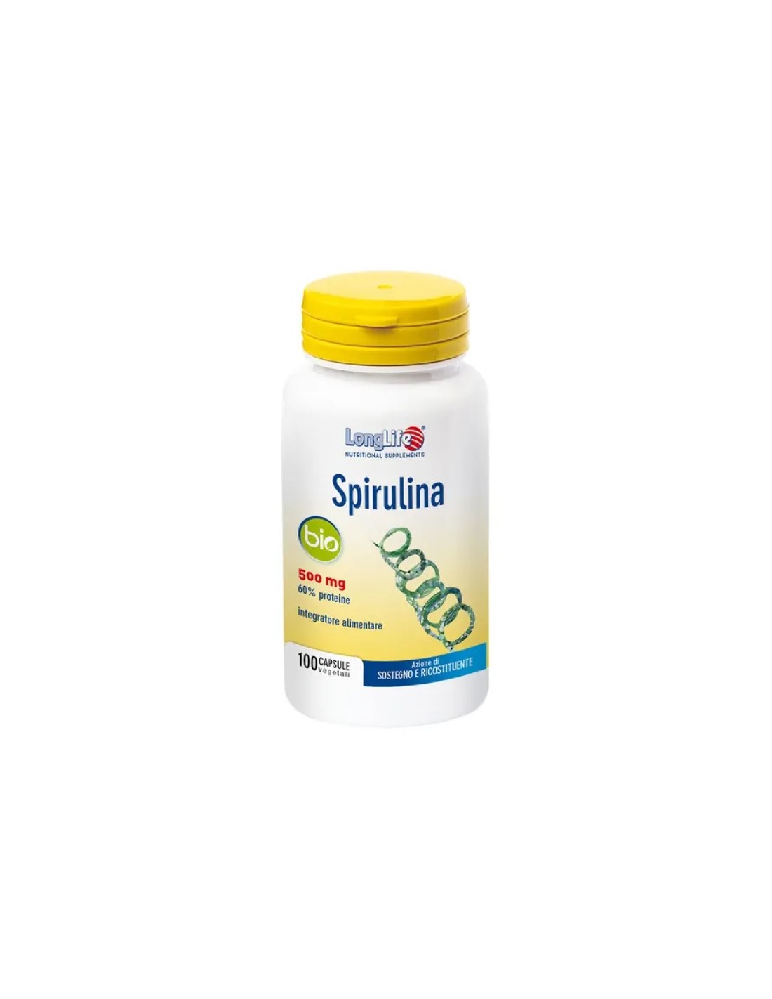 Integratori tonici e ricostituenti a base vegetale. Microalga color verde-azzurro a forma di spirale, tradizionalmente utilizzata per la sua azione di sostegno e ricostituente. Adatto a vegetariani e vegani.