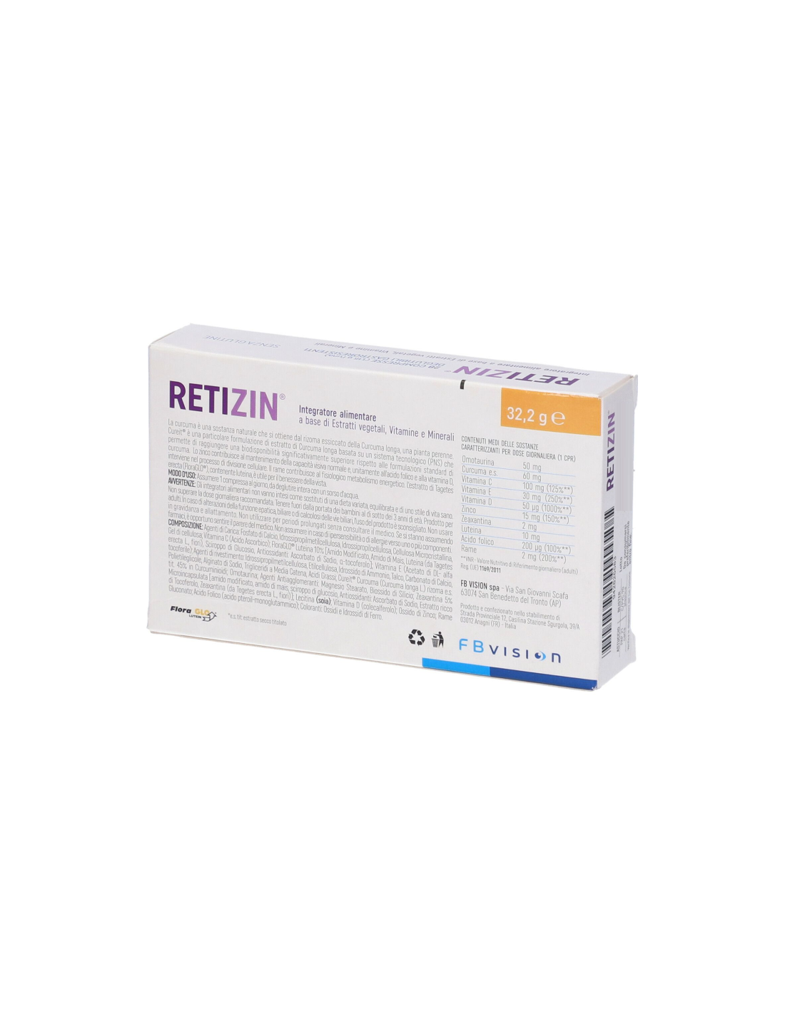 Integratore alimentare a base di estratti vegetali, vitamine e minerali. La curcuma è una sostanza naturale che si ottiene dal rizoma essiccato della Curcuma longa, una pianta perenne. Cureit è una particolare formulazione di estratto di Curcuma longa basata su un sistema tecnologico (PNS) che permette di raggiungere una biodisponibilità significativamente superiore rispetto alle formulazioni standard di curcuma. Lo zinco contribuisce al mantenimento della capacità visiva normale e, unitamente all'acido folico ed alla vitamina D, interviene nel processo di divisione cellulare. Il rame contribuisce al fisiologico metabolismo energetico. L'estratto di Tagetes erecta (FloraGLO), contenente luteina, è utile per il benessere della vista.