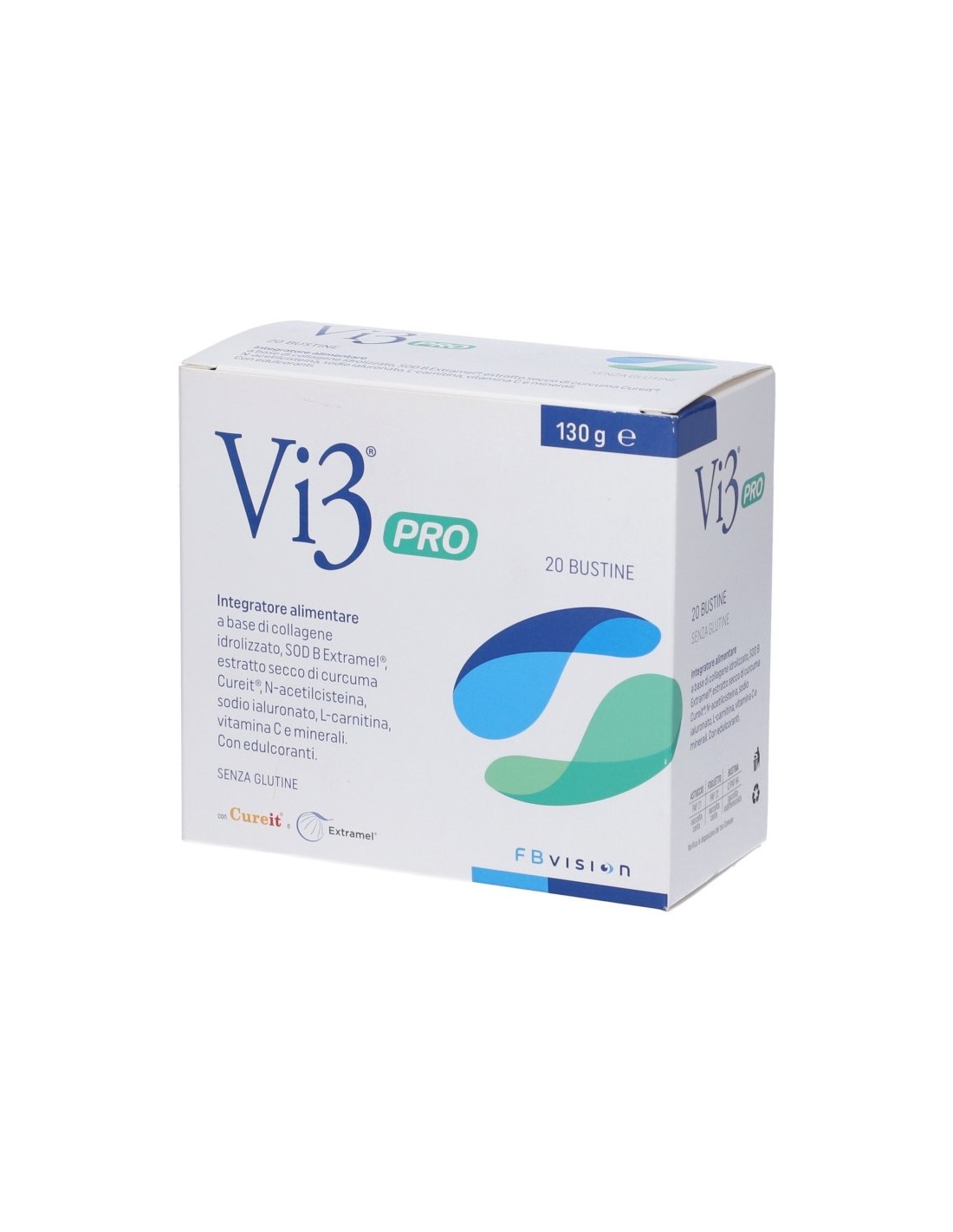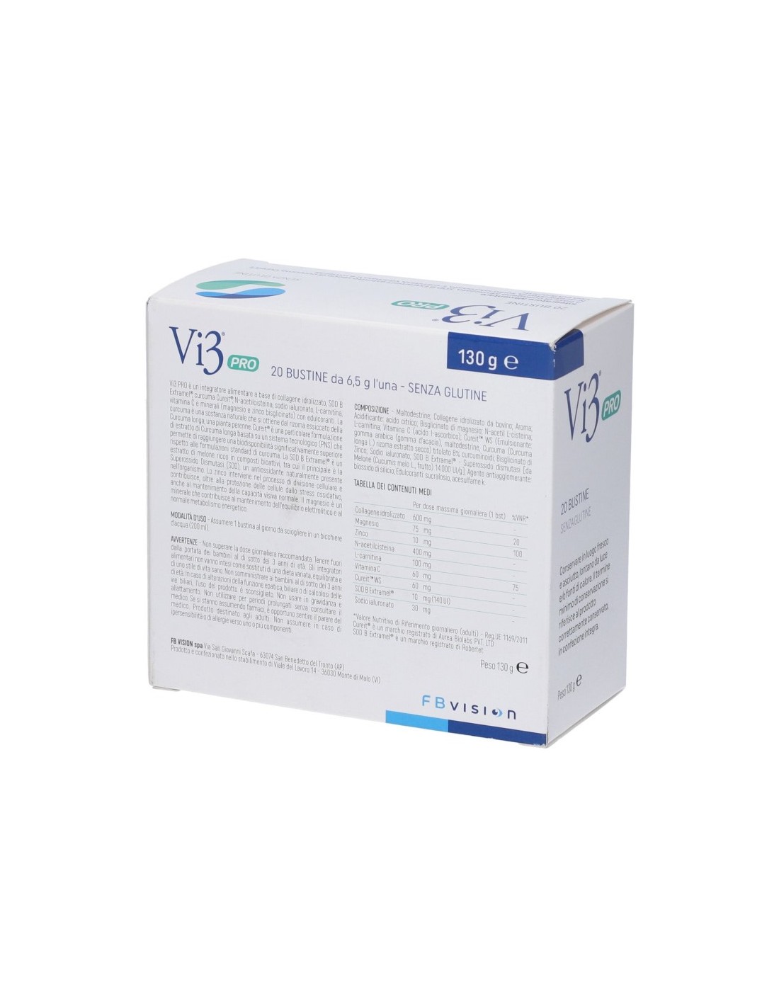 Integratore alimentare a base di collagene idrolizzato, SOD B Extramel, curcuma Cureit, N-acetilcisteina, sodio ialuronato, L-carnitina, vitamina C e minerali (magnesio e zinco bisglicinato) con edulcoranti. La curcuma è una sostanza naturale che si ottiene dal rizoma essiccato della Curcuma longa. Cureit è una particolare formulazione di estratto di Curcuma longa basata su un sistema tecnologico (PNS) che permette di raggiungere una biodisponibilità significativamente superiore rispetto alle formulazioni standard di curcuma. La SOD B Extramel è un estratto di melone ricco in composti bioattivi, tra cui il principale è la superossido dismutasi (SOD), un antiossidante naturalmente presente nell'organismo. Lo zinco interviene nel processo di divisione cellulare e contribuisce, altre alla protezione delle cellule dallo stress ossidativo, anche al mantenimento della capacità visiva normale. Il magnesio è un minerale che contribuisce al mantenimento dell'equilibrio elettrolitico e al normale metabolismo energetico.