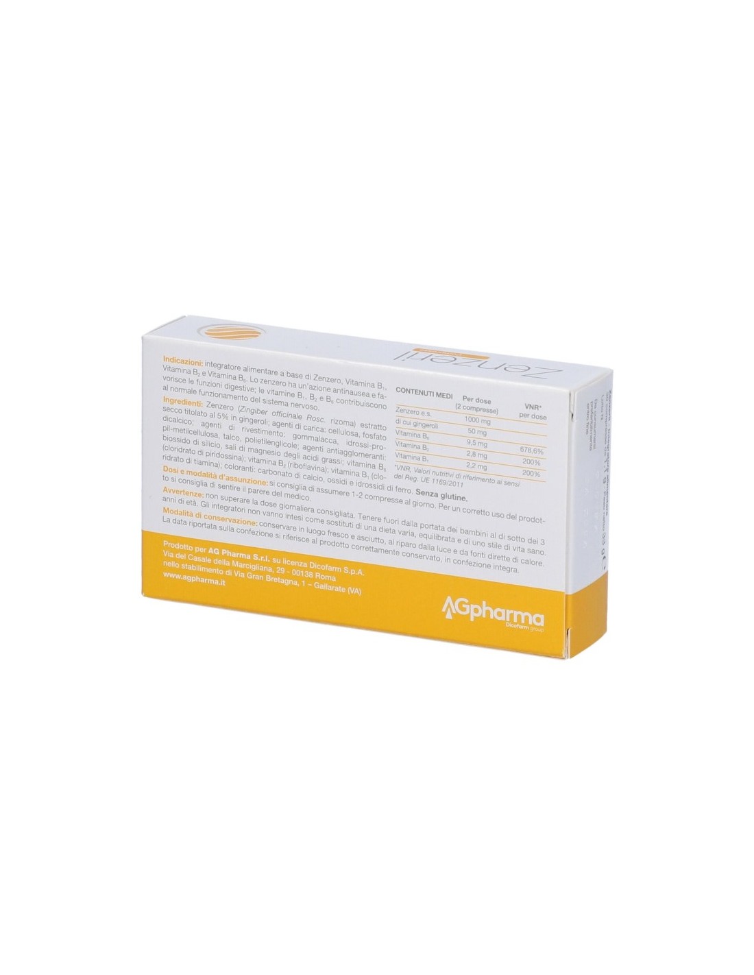 Integratore alimentare a base di Zenzero, Vitamina B1, Vitamina B2 e Vitamina B6. Lo zenzero ha un'azione antinausea e favorisce le funzioni digestive; le vitamine B1, B2 e B6 contribuiscono al normale funzionamento del sistema nervoso.