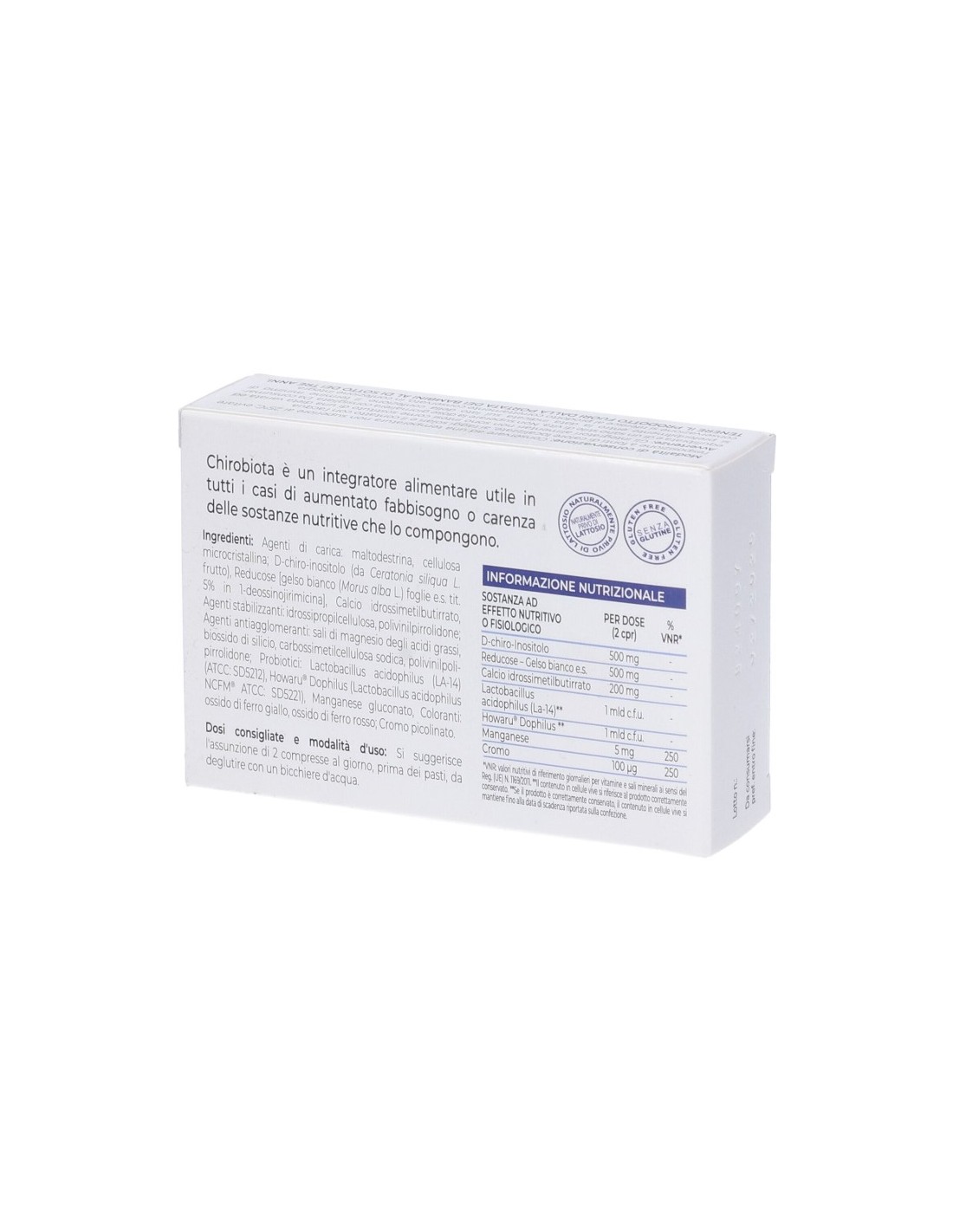 Agenti di carica: maltodestrina, cellulosa microcristallina; D-chiro-inositolo (da Ceratonia siliqua L., frutto), Reducose [gelso bianco (Morus alba L.) foglie e.s. tit. 5% in 1-deossinojiricima], calcio idrossimetilbutirrato; agenti stabilizzanti: idrossipropilcellulosa, polivinilpirrolidone; agenti antiagglomeranti: sali di magnesio degli acidi grassi, biossido di silicio, carbossimetilcellulosa sodica, polivinilpirrolidone; probiotici: Lactobacillus acidophilus (LA-14) (ATCC: SD5212), Howaru Dophilus (Lactobacillus acidophilus NCFM ATCC: SD5221); manganese gluconato; coloranti: ossido di ferro giallo, ossido di ferro rosso; cromo picolinato.