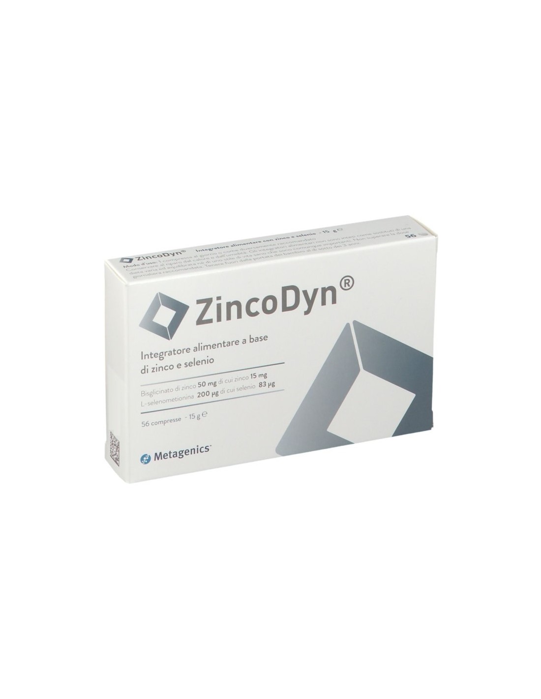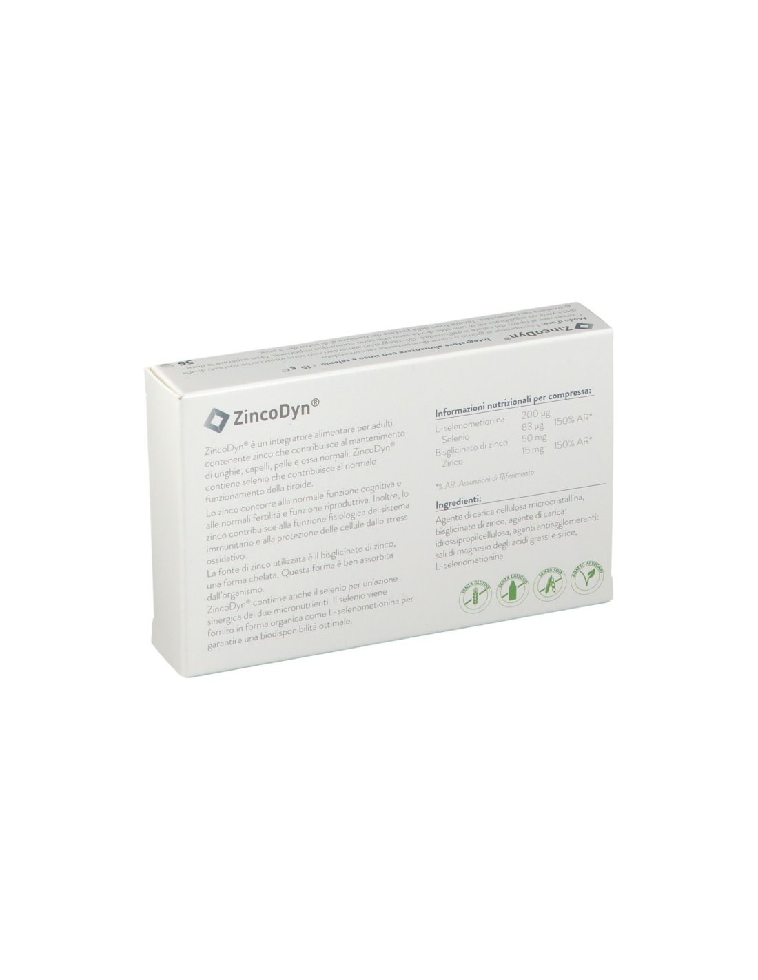 ZincoDyn è un integratore alimentare per adulti contenente zinco che contribuisce al mantenimento di unghie, capelli, pelle e ossa normali. ZincoDyn contribuisce al normale funzionamento della tiroide. Lo zinco concorre alla normale funzione cognitiva e alle normali fertilità e funzione riproduttiva. Inoltre, lo zinco contribuisce alla funzione fisiologica del sistema immunitario e alla protezione delle cellule dallo stress ossidativo. La fonte di zinco utilizzata è il bisglicinato di zinco, una forma chelata. Questa forma è ben assorbita dall’organismo. ZincoDyn contiene anche il selenio per un’azione sinergica dei due micronutrienti. Il selenio viene fornito in forma organica come L- selenometionina per garantire una biodisponibilità ottimale.