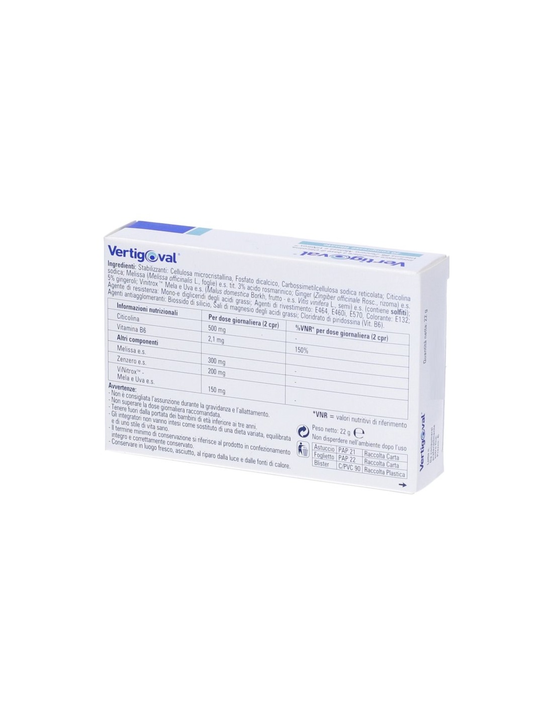 Stabilizzanti: cellulosa microcristallina, fosfato dicalcico, carbossimetilcellulosa sodica; citicolina sodica, melissa (Melissa officinalis L., foglie) e.s. (supporto: maltodestrina), zenzero (Zingiber officinalis Rosc., rizoma) e.s. (supporto: amido, maltodestrina), ViNitrox - Mela e Uva (Malus domestica Borkh, frutti; Vitis vinifera L., semi) e.s. (allergene: solfiti), agente di resistenza: mono- e digliceridi degli acidi grassi; agenti antiagglomeranti: biossido di silicio, sali di magnesio degli acidi grassi; agenti di rivestimento: E464, E460, E570, E472a; cloridrato di piridossina (vitamina B6), coloranti: E132, E171.
