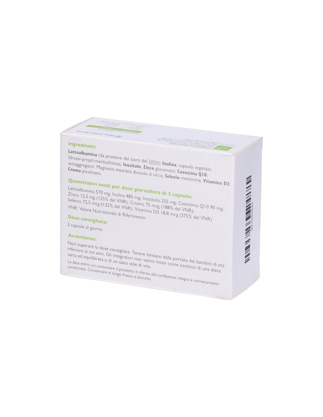 Alfa-lattoalbumina, Inulina, Inositolo, Zinco gluconato, Coenzima Q10, Selenio metionina, Vitamina D3, Cromo picolinato. Antiaggreganti: Magnesio stearato, Silice. Capsula vegetale: Idrossi-propil-metilcellulosa.