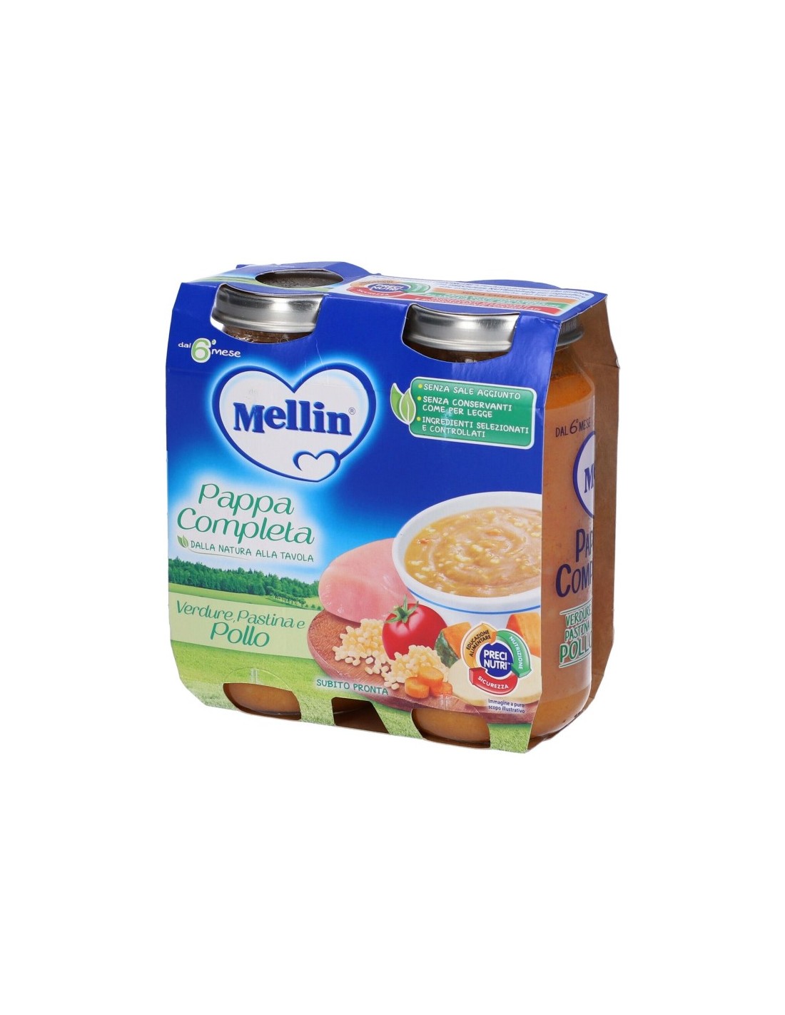 acqua di cottura; verdure (patate, carote, pomodoro); carne di pollo; maltodestrine; pastina di grano duro; amido di mais; olio di semi di girasole; cloruro di sodio.