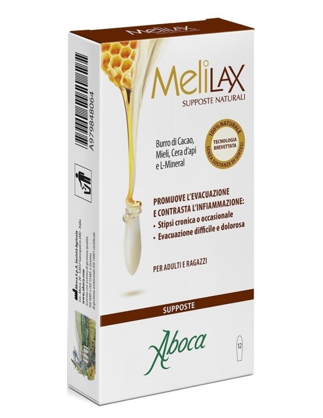 Melilax Supposte è un prodotto innovativo, completamente naturale, che promuove l’evacuazione e contrasta l’infiammazione della mucosa rettale. Grazie alla sua innovativa formulazione, Melilax Supposte si fonde alla temperatura fisiologicamente presente nel retto, così le sostanze in esso contenute possono esplicare la loro azione lubrificante, protettiva della mucosa, distensiva del retto e favorente la normale consistenza delle feci. Questo consente a Melilax Supposte di essere indicato: per soggetti con stipsi evacuativa cronica o occasionale, per soggetti non stitici che soffrono di evacuazione difficoltosa o dolorosa o che presentano patologie anorettali associate (es. emorroidi, ragadi, disturbi del pavimento pelvico). È inoltre indicato per soggetti che devono evacuare senza sforzo o in condizioni particolari (es. gravidanza, pazienti allettati o con ridotta capacità motoria) e per la prevenzione della formazione di fecalomi. Melilax supposte è un dispositivo medico naturale e biodegradabile al 100%, non contiene sostanze di sintesi, semisintesi o geneticamente modificate. Melilax supposte, pratico da usare, esplica la sua azione rapidamente, in genere tra i 15 e i 30 minuti dopo l’applicazione.