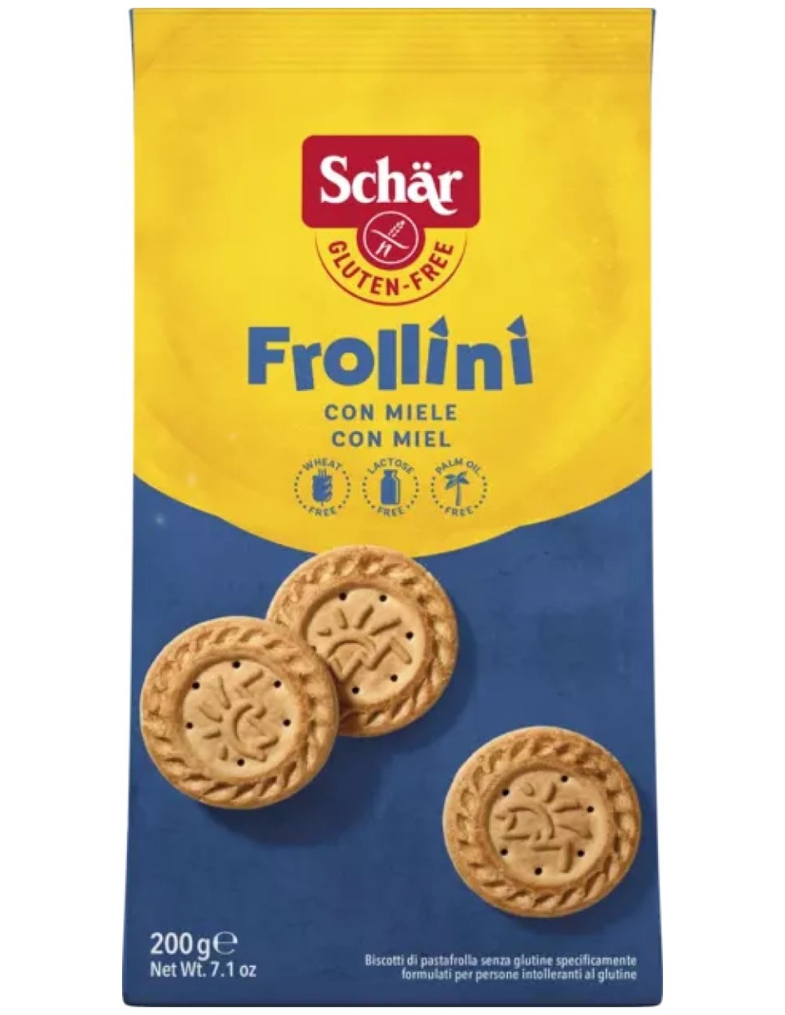 Farina di mais; zucchero; margarina vegetale non idrogenata (olii e grassi vegetali, acqua, sale, emulsionanti: mono e digliceridi degli acidi grassi ed esteri citrici dei mono e digliceridi degli acidi grassi, aroma naturale); uova 9%; fecola di patate; miele 2%; amido di mais modificato; agenti lievitanti: carbonato acido di ammonio e carbonato acido di sodio; maltodestrine; sale; amido di riso; aroma naturale.