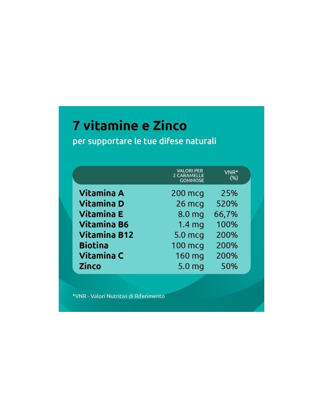 Integratore di vitamine e zinco specificamente formulato nei casi di ridotto apporto di vitamine con la normale dieta o di un aumentato fabbisogno fisiologico. Supradyn Difese Gummy è in caramelle gommose. Un nuovo modo di assumere le vitamine senza rinunciare al piacevole gusto di una caramella. Le vitamine A, B6, B12, C, D e lo zinco contribuiscono alla normale funzione del sistema immunitario. La vitamina E contribuisce alla protezione delle cellule dallo stress ossidativo. La biotina contribuisce al metabolismo energetico (trasformazione del cibo in energia).