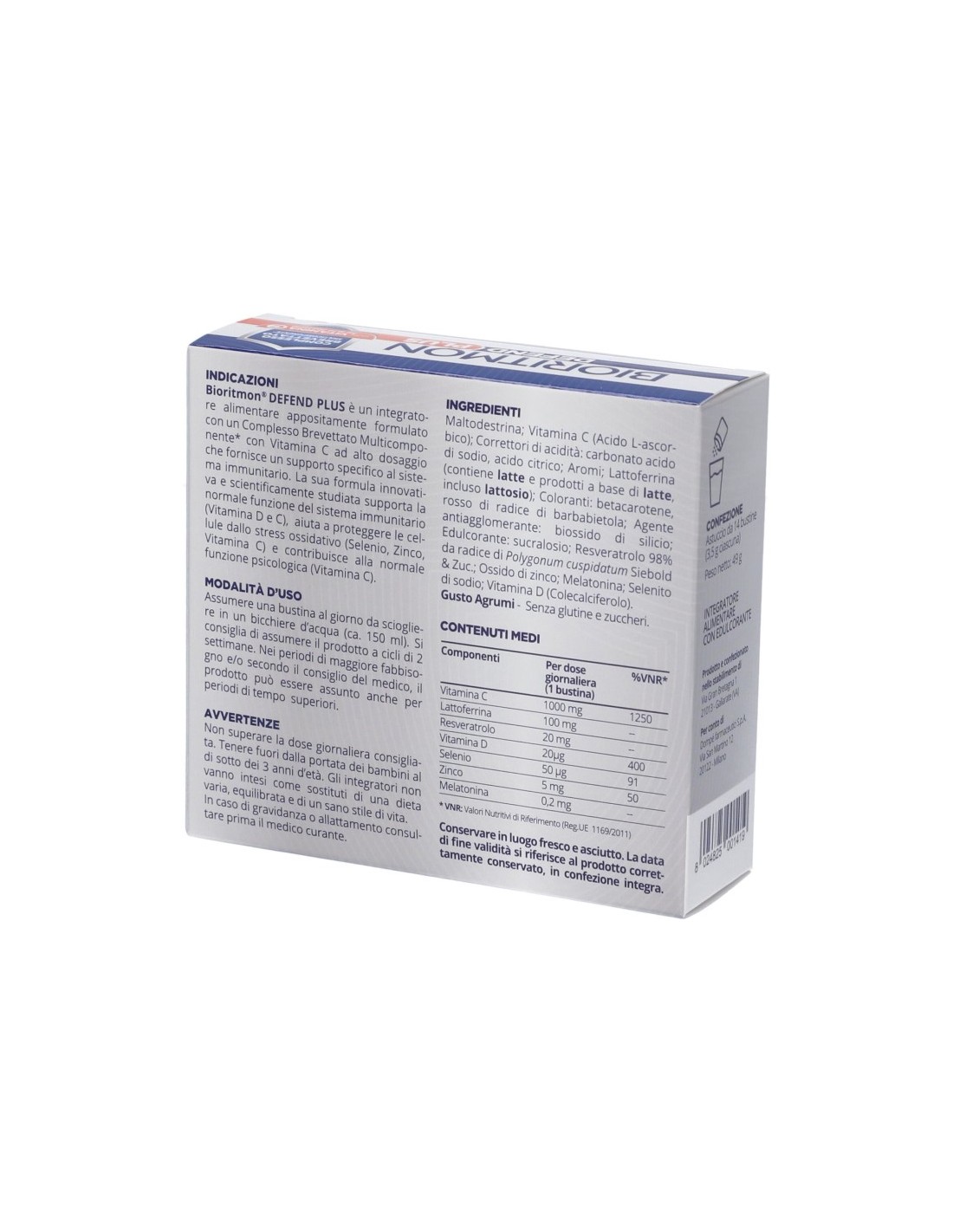 Maltodestrina, vitamina C (acido L-ascorbico); correttori di acidità: carbonato acido di sodio, acido citrico; aromi; lattoferrina (contiene latte e prodotti a base di latte, incluso lattosio); coloranti: betacarotene, rosso di radice di barbabietola; agente antiagglomerante: biossido di silicio; edulcorante: sucralosio; resveratrolo 98% da radice di Polygonum cuspidatum Siebold & Zuc., ossido di zinco, melatonina; selenito di sodio, vitamina D (colecalciferolo).