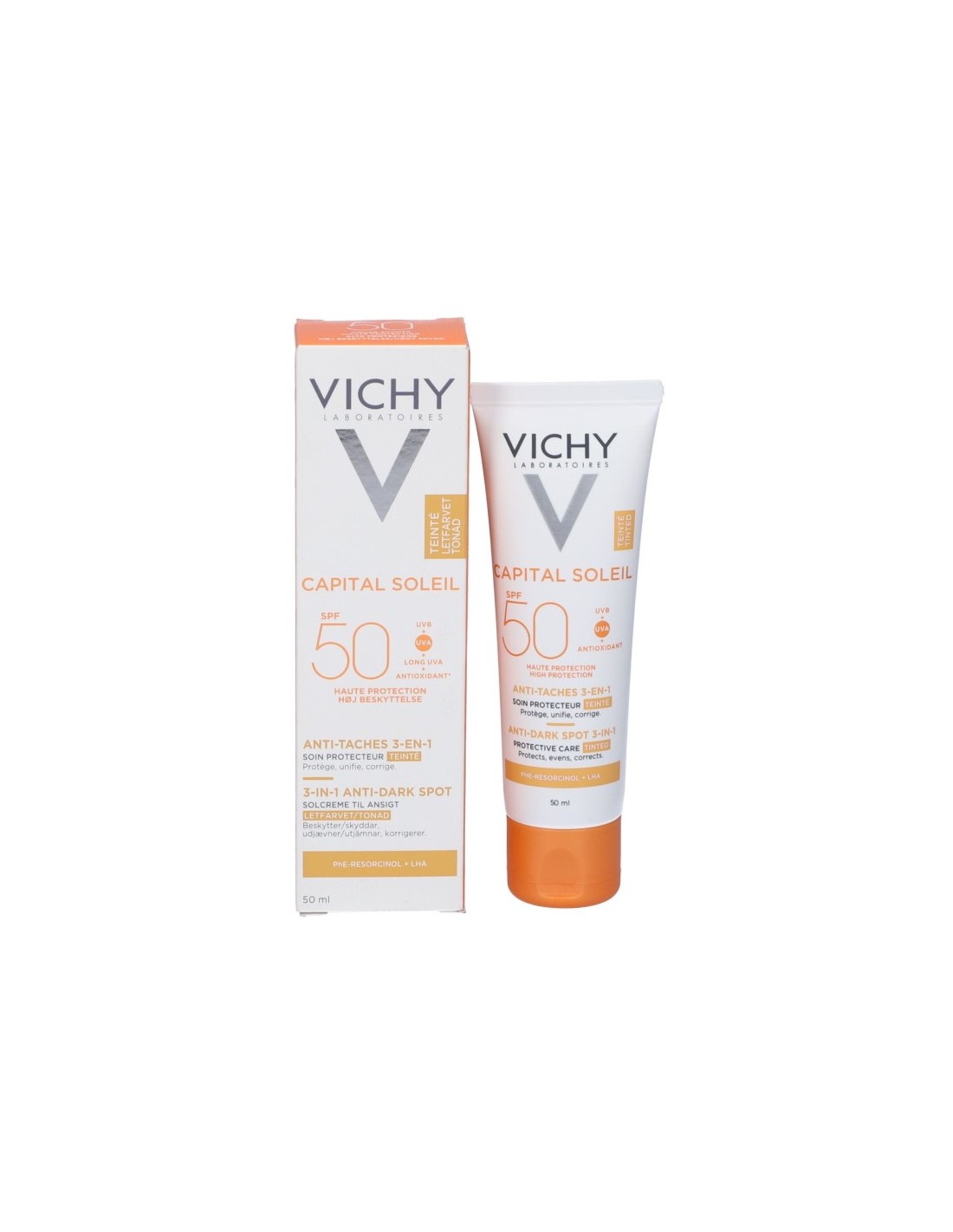 Trattamento anti-macchie colorato 3 in 1 SPF50+. Texture non grassa. Protezione molto alta. Corregge, grazie alla presenza di Phe-Resorcinolo 0,3%, noto per la sua azione anti-macchie che agisce inibendo la produzione della Tirosinasi, l'enzima responsabile della produzione di melanina. Uniforma senza appesantire, grazie alla sua texture Dry Touch a base di pigmenti minerali. Protegge dai raggi solari UVB/UVA e UVA lunghi, grazie alla sua formula arricchita in filtri fisici e chimici. Arricchito in Acqua Termale Mineralizzante di Vichy, fortifica, rigenera e riequilibra la pelle. Ipoallergenico (formulato per ridurre i rischi di allergia). Testato su pelle sensibile sotto controllo dermatologico. Per le donne.