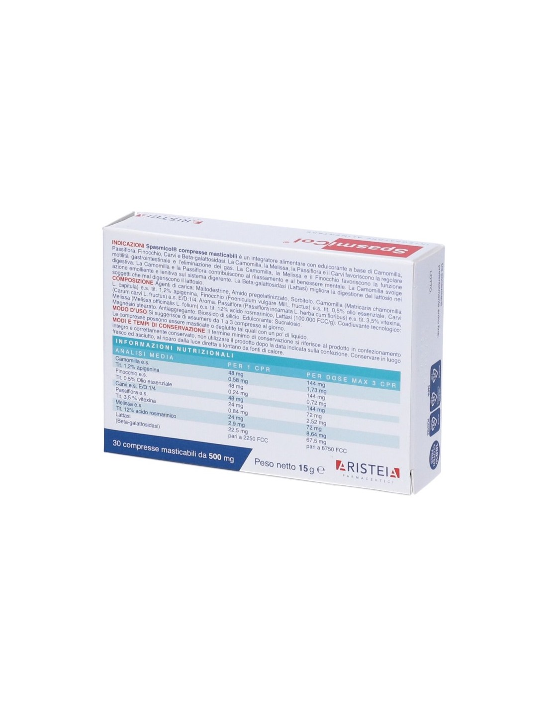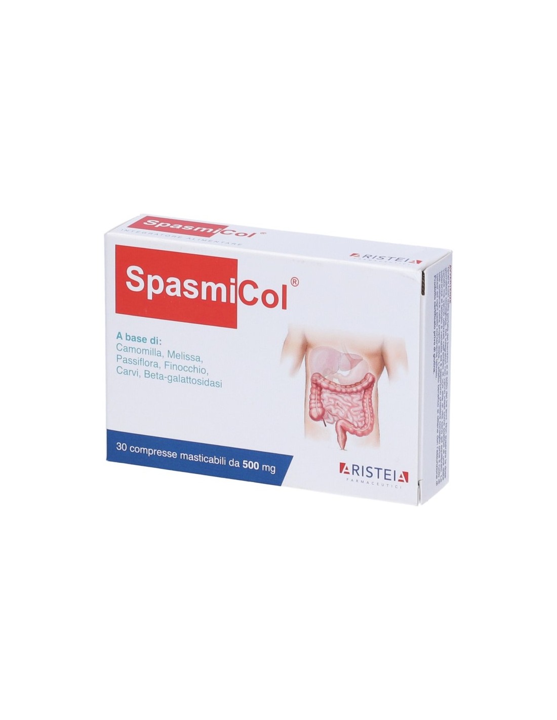 Spasmicol Compresse è utile nei casi di irregolare funzionalità digestiva, difficile motilità gastrointestinale e per favorire efficacemente l'eliminazione dei gas. Risulta utile, inoltre, nel contrastare il fenomeno della Sindrome del colon irritabile, e migliora la digestione del lattosio nei soggetti che lo mal digeriscono.