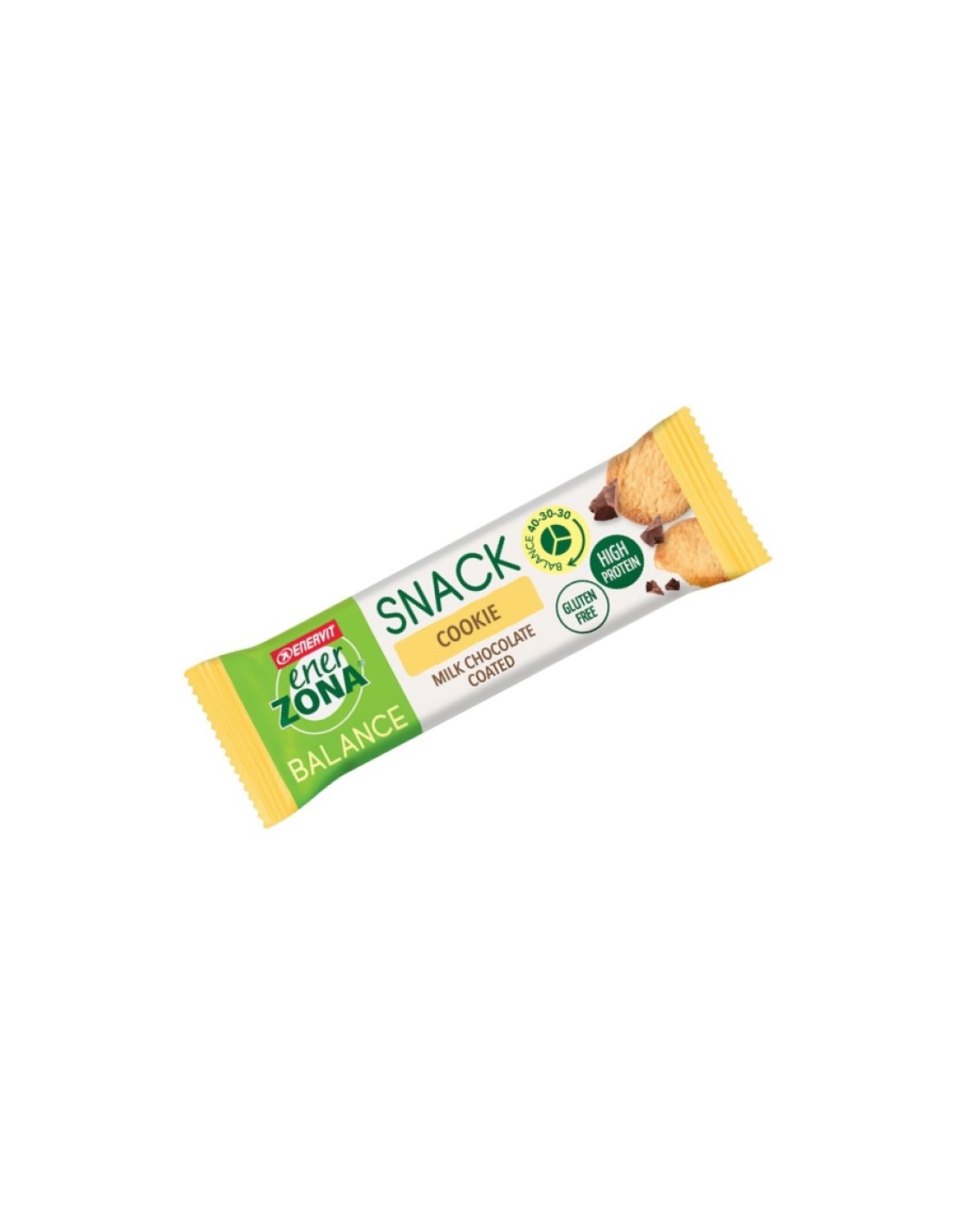 EnerZona Snack Cookie è la barretta doppio strato con granella di biscotto, ricoperta di morbido cioccolato al latte.