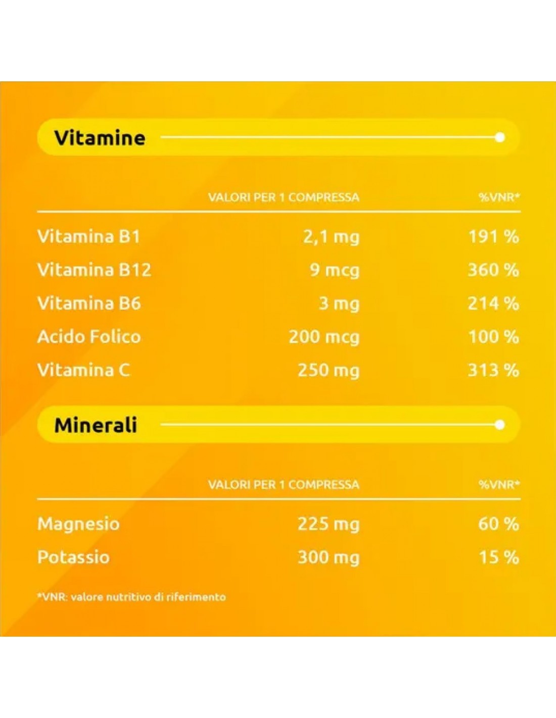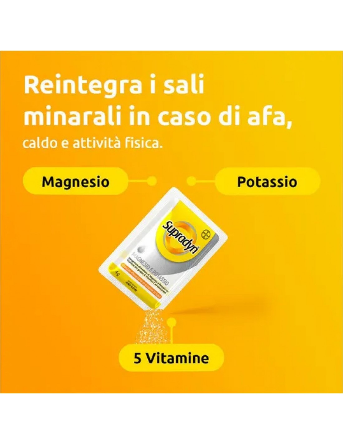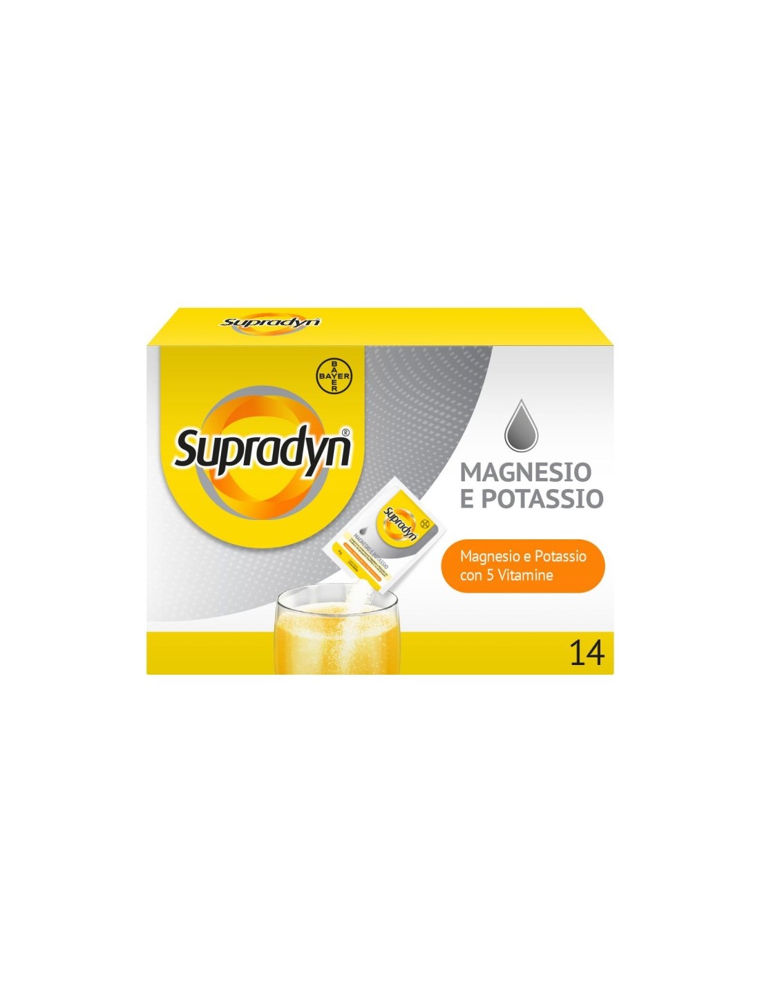 È un integratore alimentare di magnesio e potassio con vitamine. Supradyn Magnesio e Potassio è particolarmente indicato nei casi di aumentato fabbisogno fisiologico o di ridotto apporto con la normale dieta. La sua formula contribuisce a ridurre stanchezza e affaticamento e a mantenere, grazie alla presenza del magnesio, l’equilibrio elettrolitico/idrosalino. Supradyn Magnesio e Potassio non contiene zucchero e ha un bassissimo contenuto di sale (sodio).