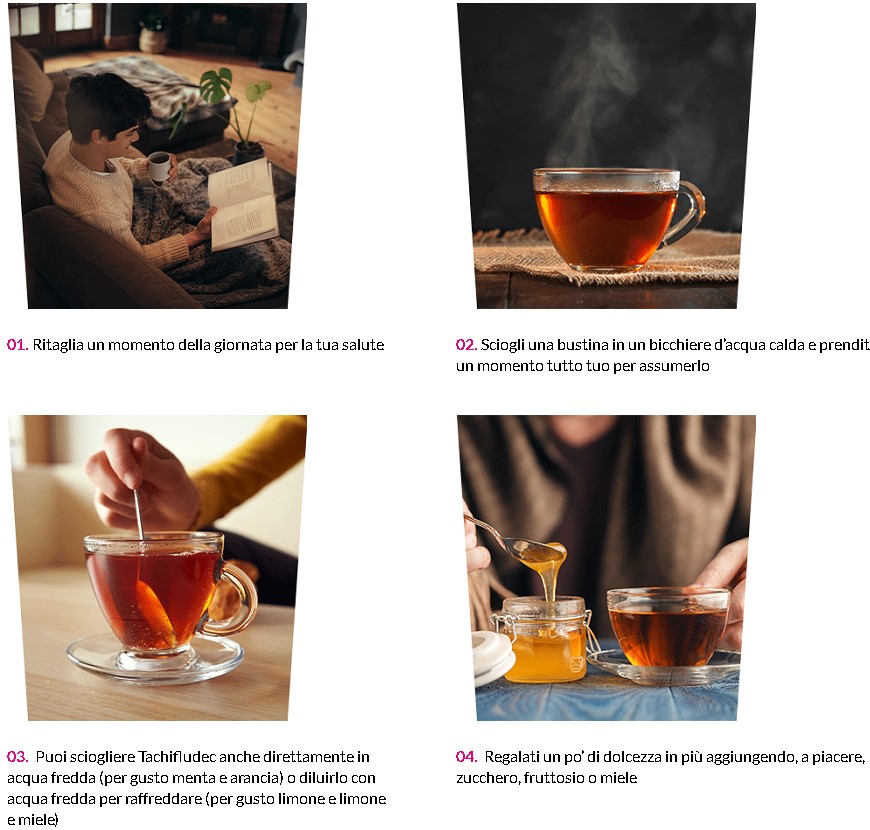 Sciolto in acqua calda, Tachifludec è una calda cura che decongestiona le vie nasali e combatte in fretta i sintomi del raffreddore e dell’influenza.