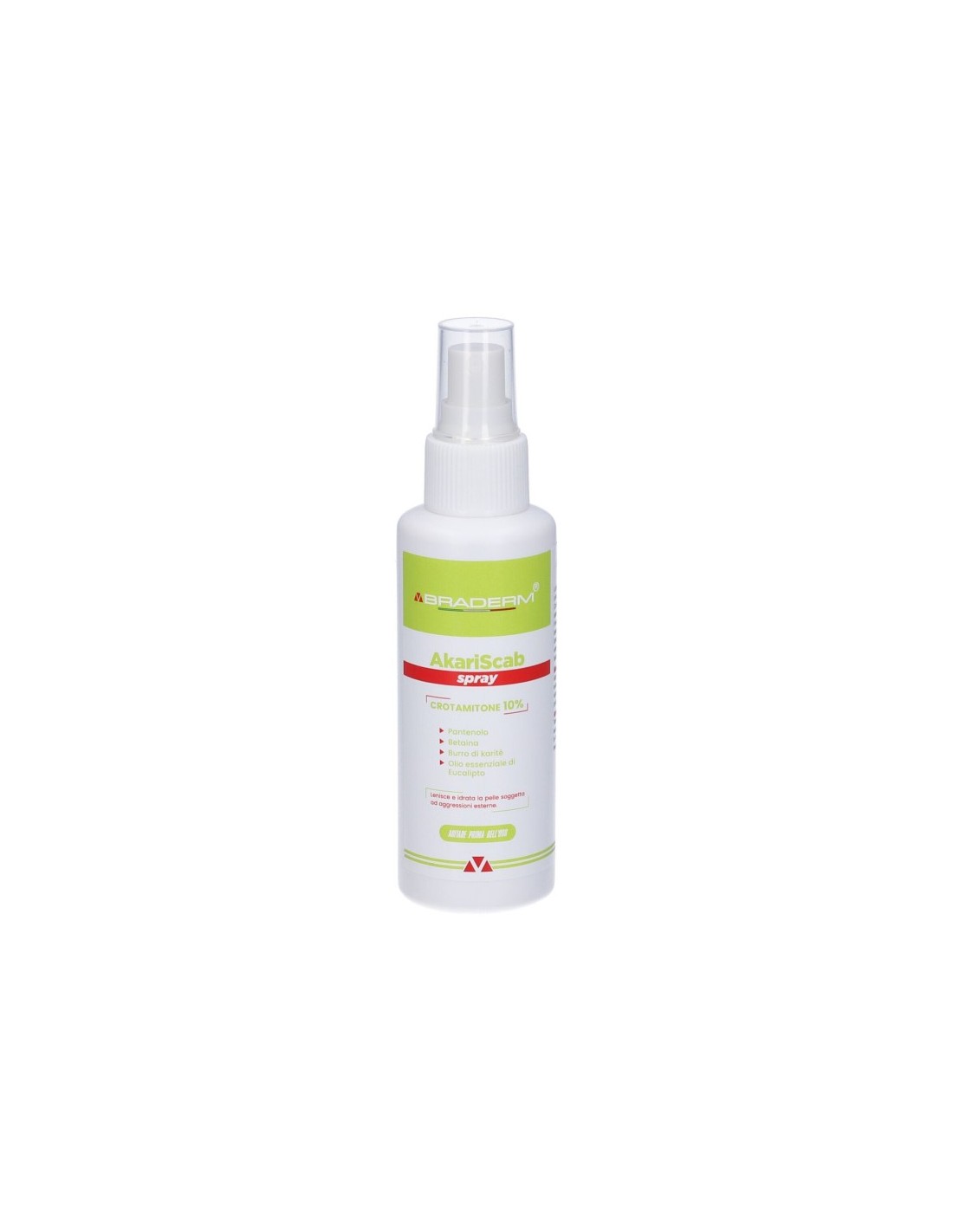 Lozione spray coadiuvante nelle parassitosi cutanee, specifica per cute e cuoio capelluto nella cura della pelle in caso di parassiti e nella loro prevenzione. Contenente pantenolo e crotamitone che, grazie alla loro azione lenitiva, attenuano la fastidiosa sensazione di prurito e aiutano a prevenire l'insorgenza di fenomeni cutanei provocata da agenti parassitari. La betaina, insieme a pantenolo e burro di karitè, ripristinano la naturale idratazione della cute, formando un film che la protegge da aggressioni esterne. L'olio essenziale di eucalipto lenisce le irritazioni della pelle e lascia una gradevole sensazione di freschezza.